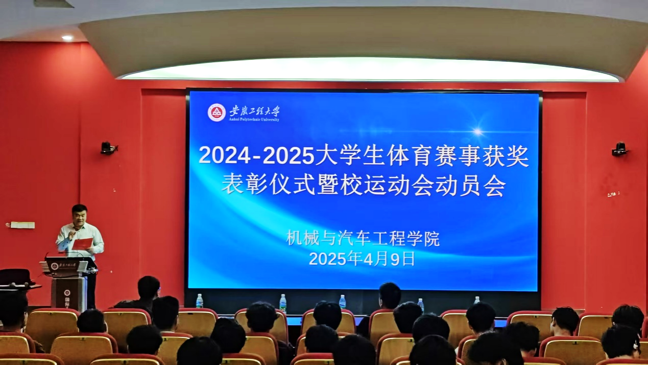 本网讯 4月9日,机械与汽车工程学院在国际工程师学院报告厅举行2024-2025年度大学生体育赛事获奖表彰仪式,同时召开校运动会动员会。学院院长王建平、党委副书记秦广虎、副院长王建彬、辅导员代表、获奖学生代表、2025校运动会运动员代表参加活动。安徽新丝路楼宇科技有限公司(赞助企业)总经理吴文炳受邀参加。活动由辅导员程雷主持。