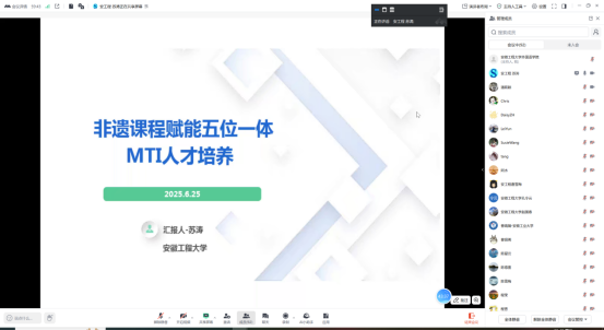 苏涛带来“非遗课程赋能五位一体MTI人才培养”主题分享。他以《铁画艺术翻译》非遗特色课程为例,从课程创设背景、实施过程、建设成果及教学反思四个维度,系统讲述了该课程从无到有、发展为校企共建特色课程的历程。课程建设期间,学院成立铁画艺术翻译与国际传播研究中心,联合芜湖市铁画协会、博物馆打造科教融创实践基地,构建起产学研教创五位一体的MTI人才培养模式。在教学反思环节,苏涛针对AI时代人才培养提出思考,强调硕士生导师应明晰培养目标,引导学生合理运用AI技术,全方位提升社会适应能力。