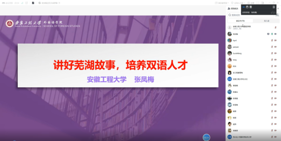 本网讯 6月25日,由安徽省外国语言文学学会翻译教学工作委员会主办、我校外国语学院承办的“徽译大讲堂”第二期活动——“徽文化外译的芜湖实践”在线上成功举办。本次活动吸引了全省近百位教师云端相聚,由外国语学院院长唐雪梅主持,外国语学院张凤梅教授、苏涛副教授担任主讲嘉宾,共探徽文化外译实践与人才培养的新路径。
