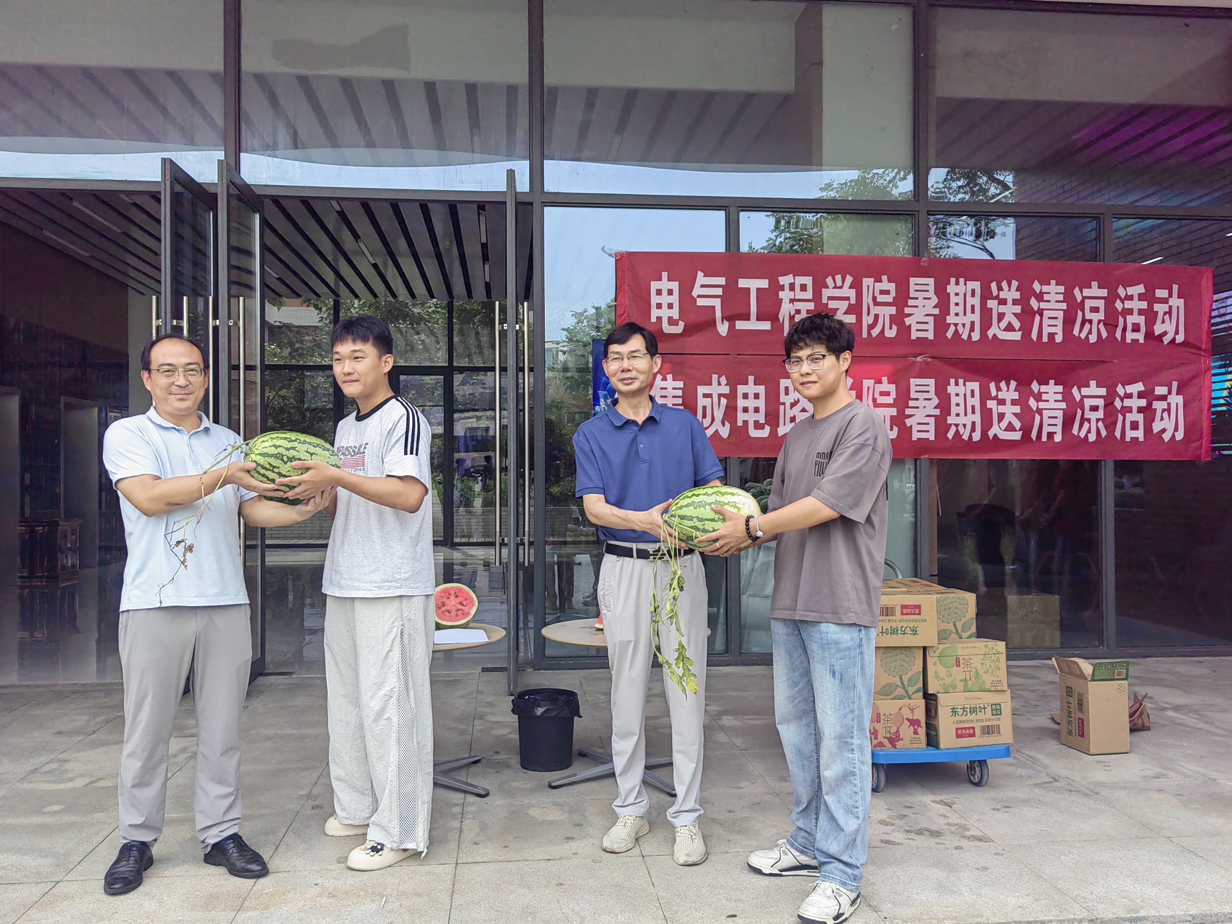 本网讯 7月16日,电气工程学院在国际工程师学院校区举行2025年暑期留校学生“送清凉”活动。学院党委书记杨会成、党委副书记迟传德、团委书记及相关辅导员到场参加。