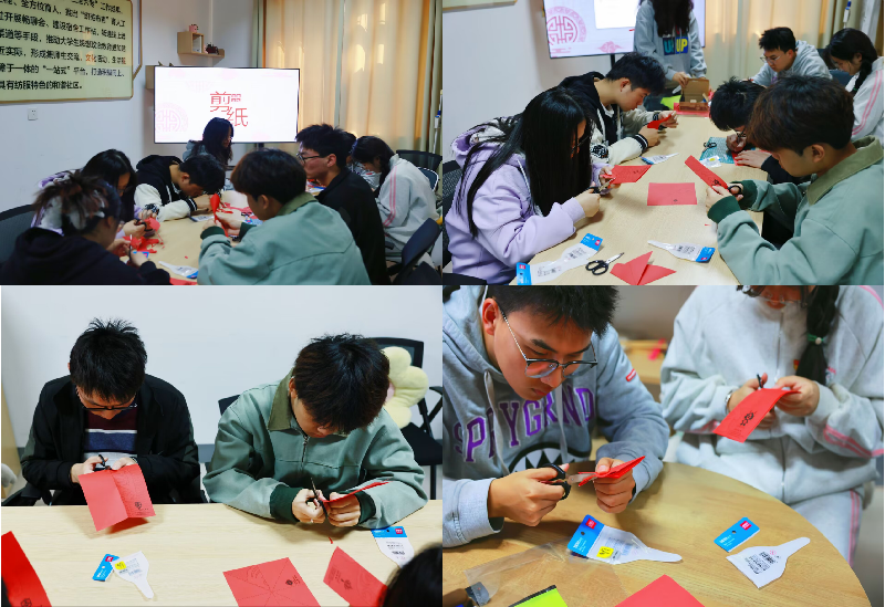 活动中党员常付荣仔细介绍了剪纸的历史渊源及文化内涵,让大家充分领略到剪纸的文化意义,同时帮助同学们系统了解非遗剪纸的分类及制作过程。在她的指导下,手中的一张张红纸变成了一幅幅鲜活灵动的图案。此刻传统文化的融入为社区文化建设注入了新活力,也为同学们校园生活带来了丰富多彩的新体验。