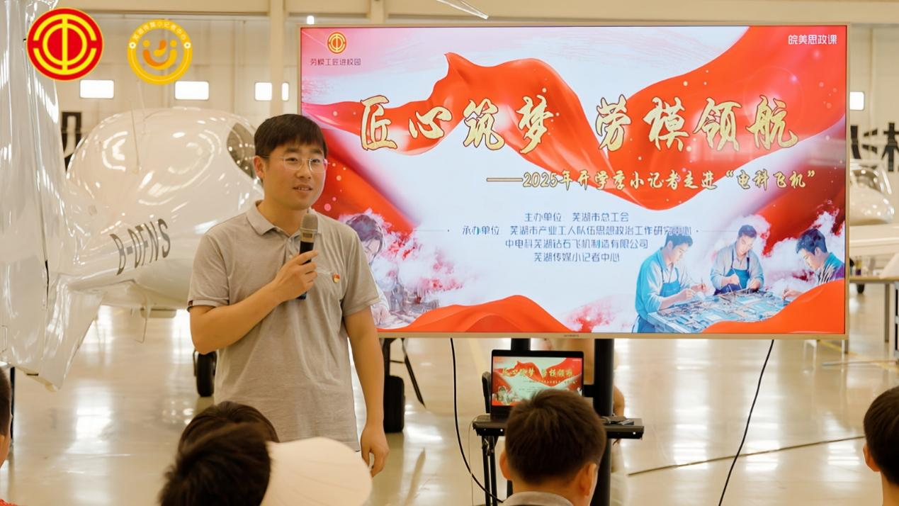 本期活动聚焦小学生群体,组织芜湖传媒小记者中心的40余名小学生记者走进中电科芜湖钻石飞机制造有限公司(以下简称“电科飞机”),以沉浸式体验教育为载体,让孩子们在亲眼所见、亲耳所闻、亲身感受中,传承和弘扬劳模精神、劳动精神、工匠精神。活动现场,小学生在工作人员的悉心引导下,参观了电科飞机总装车间和机库。一架架待组装的钻石飞机整齐排列,宛如蓄势待发的雄鹰,激发了小朋友们的无限好奇与兴奋。长三角大工匠、安徽工匠年度人物李勇为小朋友们分享了自己的成长故事。李勇以亲身经历鼓励孩子们努力学习、勇于探索。互动环节中,小朋友们踊跃提问,现场气氛热烈。