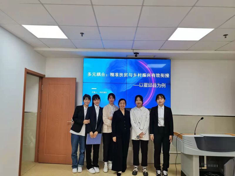 本次大赛分论文撰写、线上汇报、专家提问、总结陈词四个环节。论文撰写阶段,参赛队员多次前往霍邱县乡村振兴局进行实地调研,全面掌握第一手资料,高质量完成参赛文本的撰写;线上决赛时,率先出场,队员们顶住压力、沉着冷静、有条不紊地汇报了课题内容和研究成果,高质量回答了评委老师的提问,得到了现场老师的充分肯定。