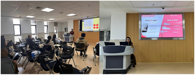 活动分经验分享与新教师教学展示两个阶段。第一阶段,两位教师分别围绕“课程思政教学设计”与“一门课程的教学设计”两个主题做了分享。安徽省课程思政教学名师闫石深入剖析了“新文科背景下如何结合专业开展课程思政教学”,通过生动案例激发学生兴趣,巧妙嵌入思政元素,不仅展现了教学设计的深度与广度,更为在场教师提供了丰富的教学灵感。随后,省级教坛新秀张茜做了“依托‘66推’的BOSLA流程——《管理学原理》混合式教学创新实践及推广”的高水平分享,展示了教学创新的无限可能,激发了教师们对于教学改革的深度思考。