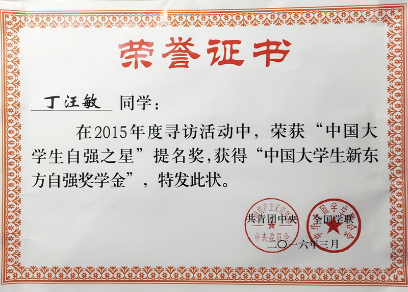 汪敏获2015年度“中国大学生自强之星”提名奖称号