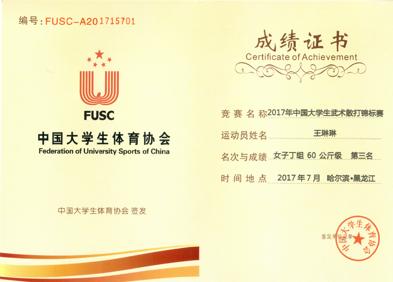 2017年王琳琳获中国大学生武术散打锦标赛第三名