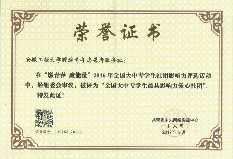 2017年“暖途”青年志愿服务社荣获“全国大中专学生最具影响力爱心社团”