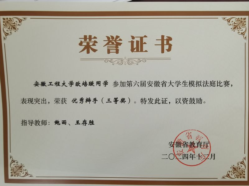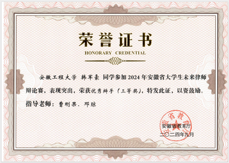 安徽省大学生未来律师辩论赛优秀辩手(三等奖)