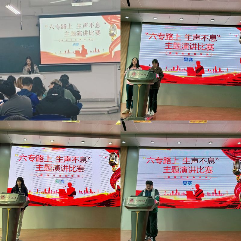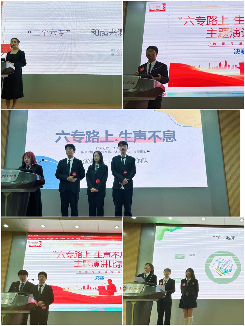 为展示新时代青年朝气蓬勃、奋发有为的精神面貌,4月13日下午,数理与金融学院在5教117举办“六专路上·生声不息”主题演讲比赛决赛。校党委巡察办秘书苏燕南、学院辅导员担任评委,统计211班何运鸿主持活动。本次演讲比赛经历了宣传发动、自主报名、班级初赛、年级复赛四个阶段,近百位学生参与,最终八支队伍脱颖而出,顺利进入决赛。比赛旨在锻炼学生语言表达能力以及临场发挥能力,动员更多同学积极参加学校“三全六专”育人实践。