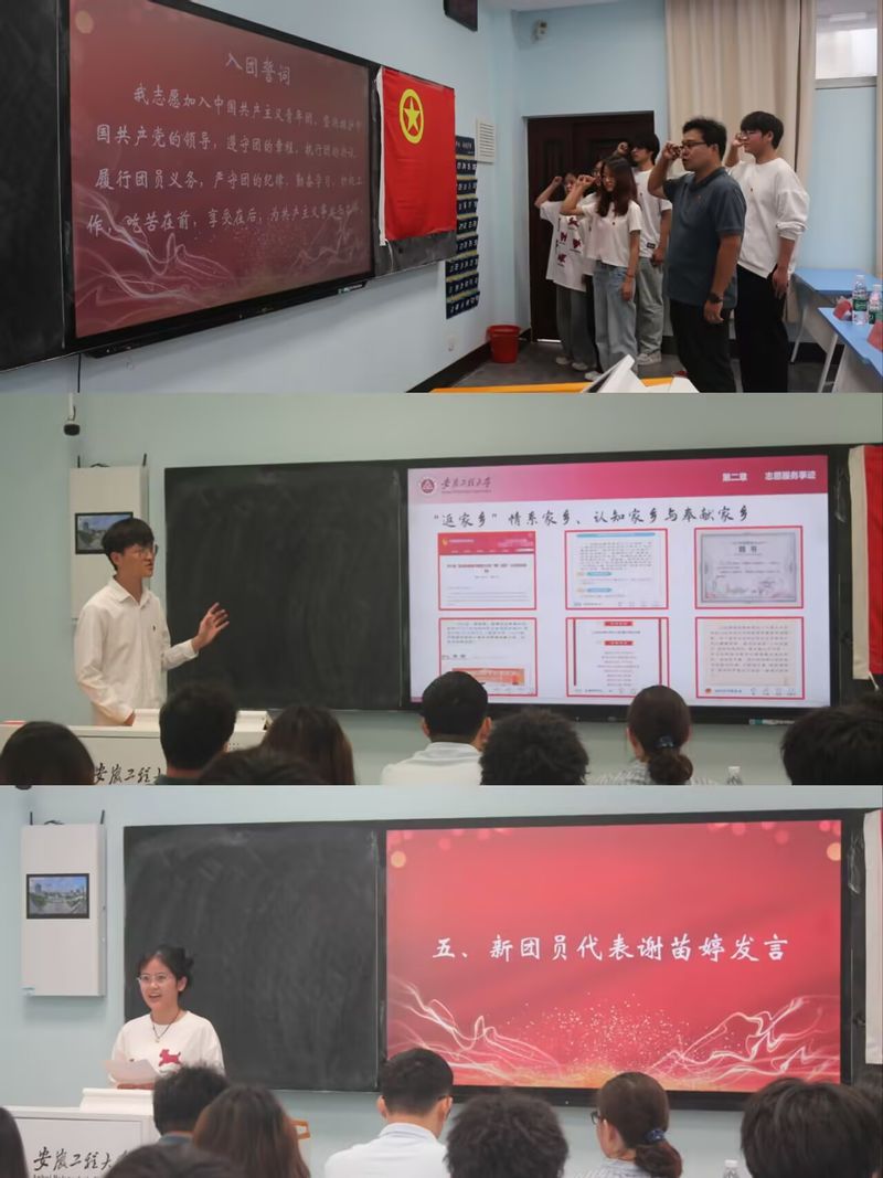 仪式在庄严的国歌声中拉开帷幕。程安琪介绍本期团员发展情况,与会领导为新团员代表佩戴团徽,汤建文带领新团员庄严宣誓。