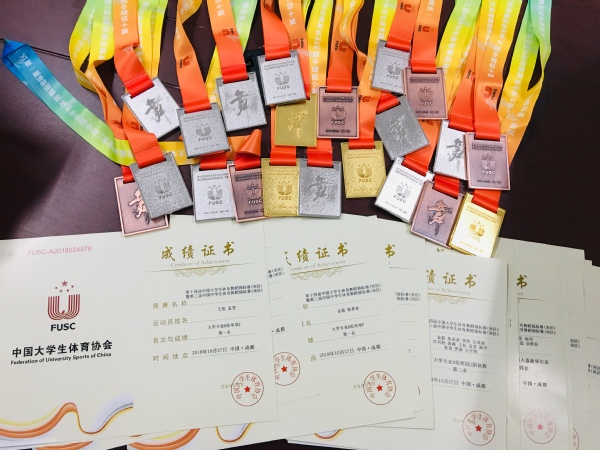 我校体育学院18名学生组成的体育舞蹈代表队在领队金庆红主任、教练叶子老师和许诚老师的带领下,参加了大学专业B组的单人及集体项目,经过多轮次的激烈角逐,我校夺得2金1银4铜第四名3个和第六名3个的佳绩!其中金磊、张香亚两位同学荣获大学专业院校B组单项P第一名、单项C第三名和大学专业院校B组五项L第三名;王旭、孟莹两位同学荣获大学专业院校B组单项J第一名和大学专业院校B组四项L第三名;江兴豹、张栋荣获大学专业B组单项F第三名;李阳、张宇、罗杨等12位同学荣获大学专业院校B组校园J团体舞第二名。