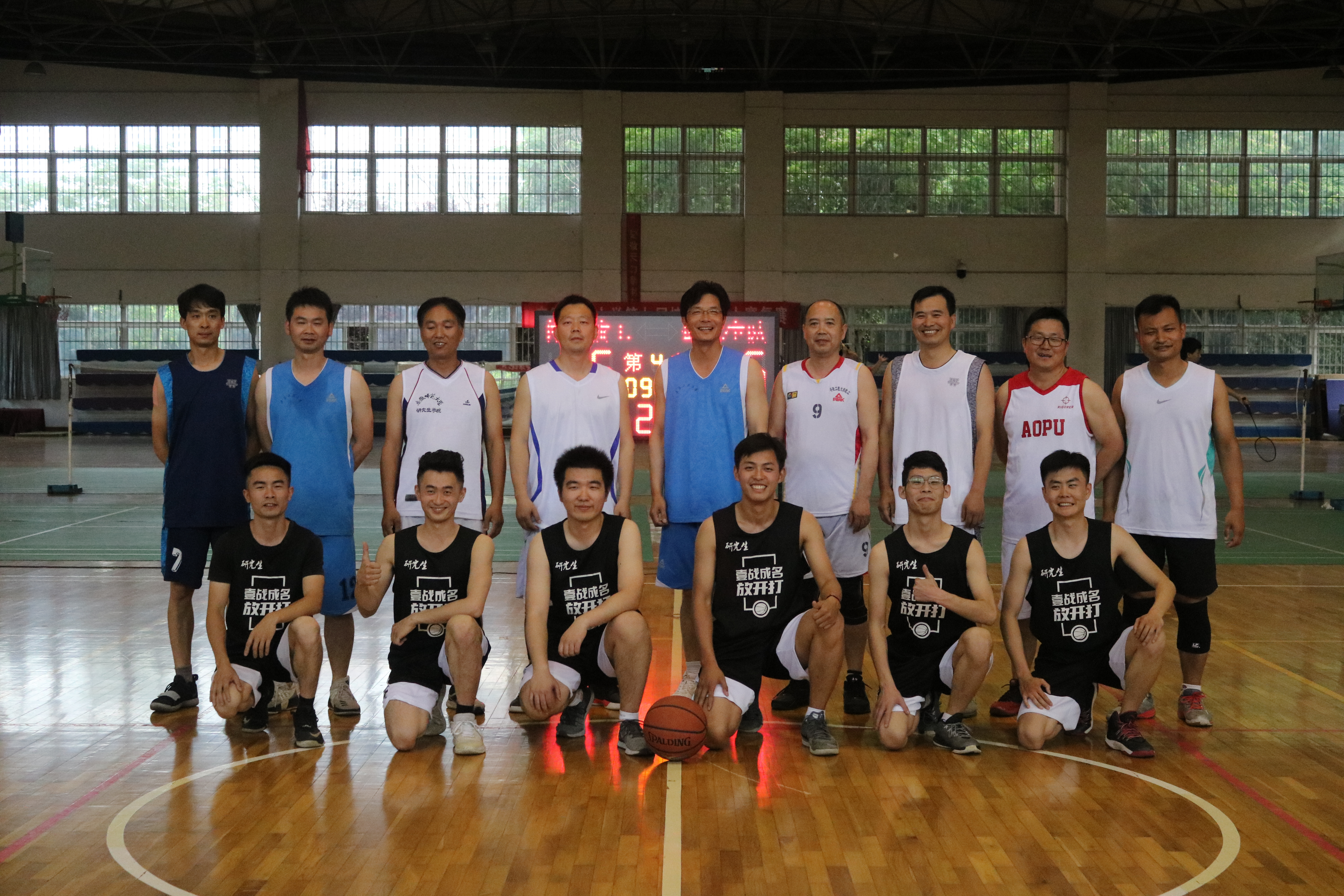 最后,师生篮球友谊赛在体育馆隆重举行。48分钟的比赛时间内,研究生同学与老师们进行了一场精彩对决,比赛气氛欢乐融融。通过此次比赛,即提高同学们的专业能力,强健了体魄,又促进了师生间的情感交流。