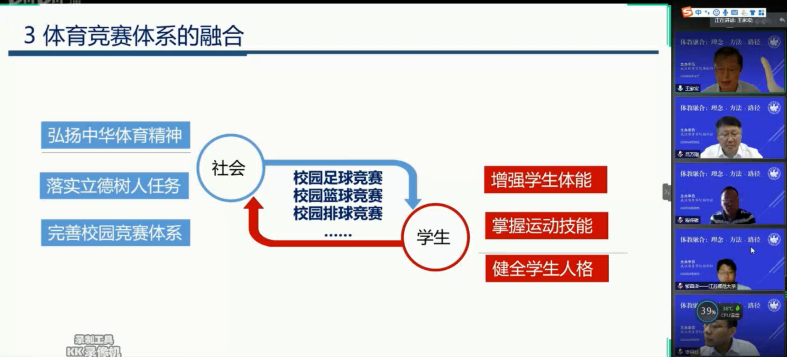 研讨会的第二单元由杨国庆、王凯珍、张欣、邢金明、郇(huan)昌店五位专家解读了体教融合的理念。专家们根据我国的体育教育的发展特点及现状,从体教融合的内涵、理念、路径、挑战、逻辑起点、战略价值分析等方面深刻的解读了体教融合所传达的教育观念和意义,帮助屏幕前的学习者们更好的去理解体教融合所以蕴含的价值、机会和挑战。王凯珍提出:“体教融合要全学段覆盖:从幼儿体育教育开始”。