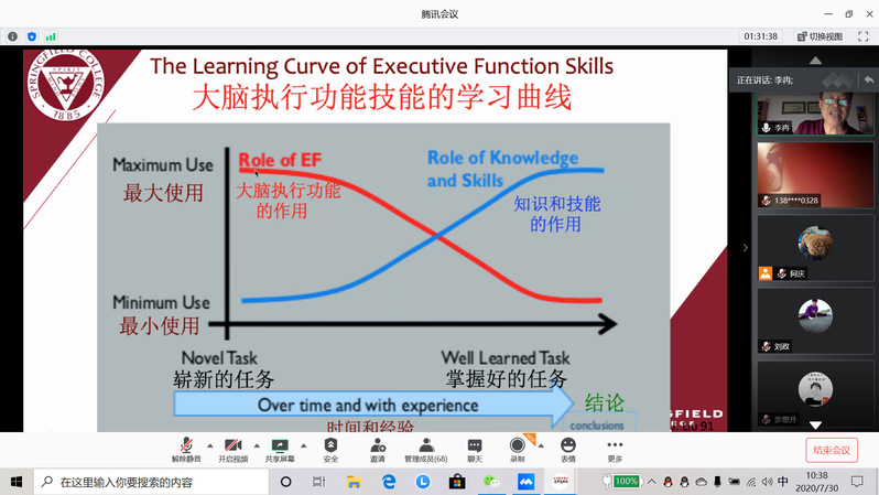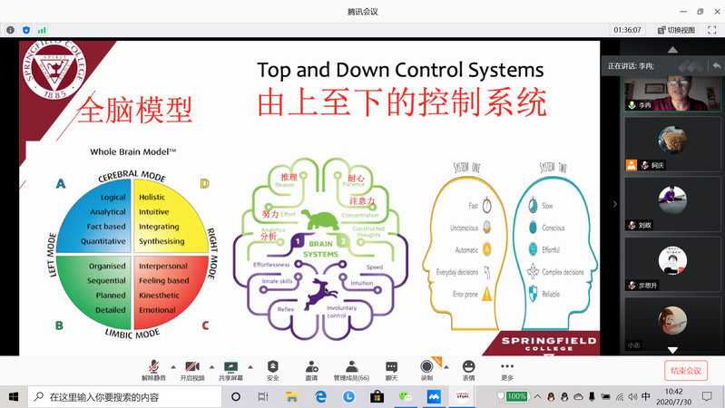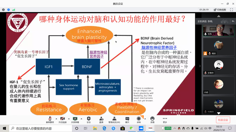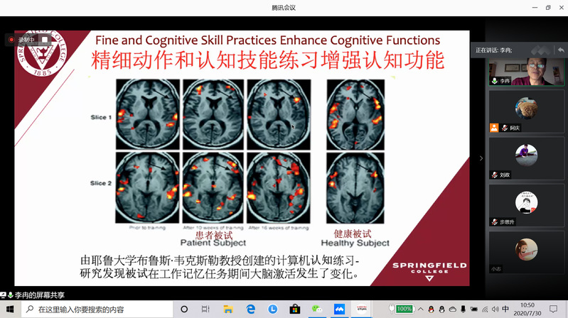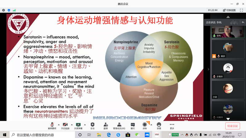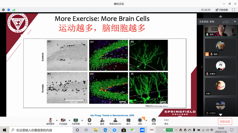 2020年7月31日,应我院邀请,美国春田学院体育健康系终身正教授和博士生导师,美国春田学院霍英东体育运动交流基金项目主任刘展教授在线为我院作了题为《身体运动对脑健康和认知功能的促进研究》的学术报告。报告会由院长胡好主持,学院50余名师生在线收听了报告。