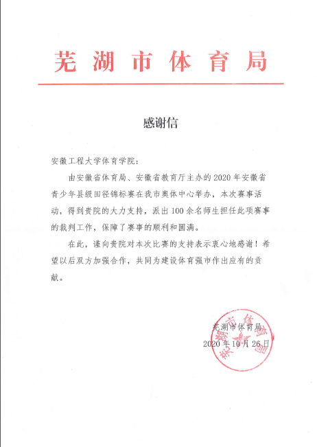 芜湖市体育局向我校体育学院发来感谢信,感谢我校师生为2020年安徽省青少年县级田径锦标赛的顺利进行所做出的贡献。
