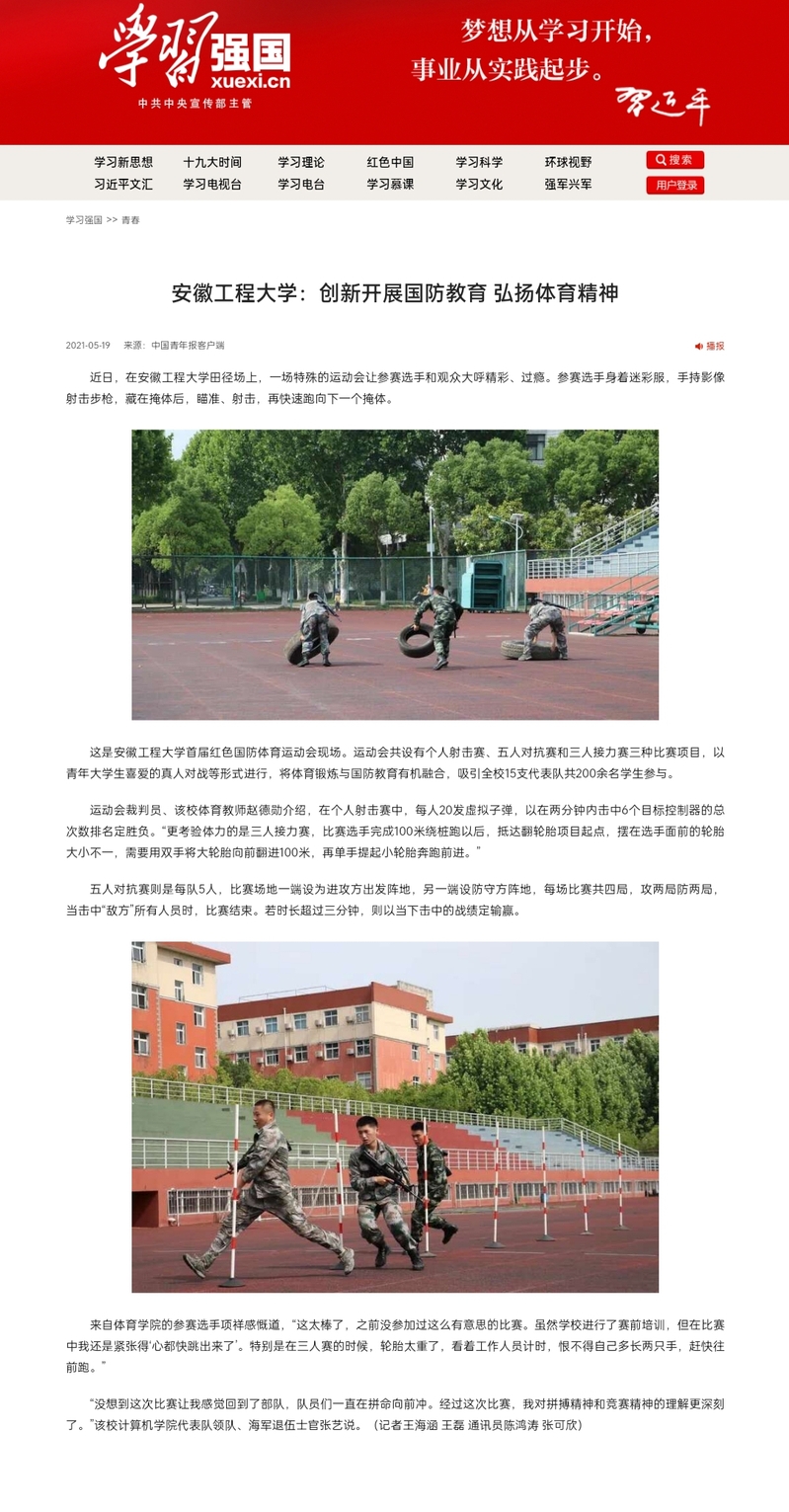 为庆祝中国共产党成立100周年,进一步学习贯彻习近平新时代中国特色社会主义思想,加强大学生国防教育建设,培养爱国主义、集体主义精神,推动国防体育运动在高校的传播。在校学工部、武装部、团委和体育学院的联合主办,体验产业学院党支部、体育学院团总支和国防教育协会的承办下,举办了我校首届红色国防体育运动会,共吸引了近200名在校大学生和研究生,共15支队伍参赛。515日上午9时许,打响比赛的第一声枪响,经过为期两周的激烈角逐,在527日下午完成颁奖仪式,比赛圆满落下帷幕。