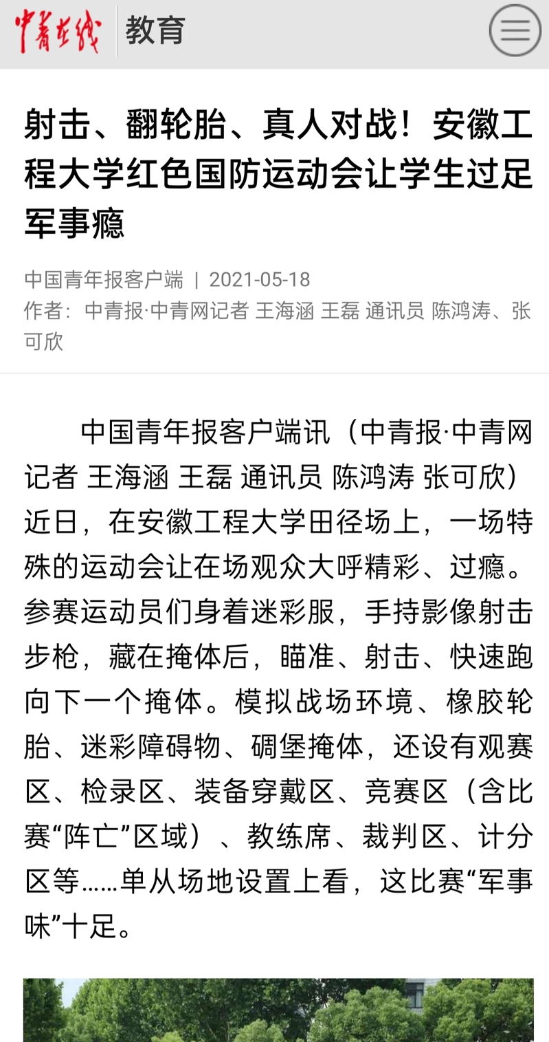 国防体育运动是一项非常适合大众参与的全名运动健身项目,他通过越野、射击、对抗等运动手段,结合军事训练题材,充分将爱国主义教育和国防教育与运动相融合。当前正值中国共产党建党一百周年,国内外形势异常严峻,我们通过这种方式,将国防教育变被动式教育为主动式参与,激发了国防教育的活力,提升同学们的民族自豪感。我们将一如既往地不忘初心,脚踏实地,志存高远,砥砺奋进,推动我校国防体育运动和国防教育地发展。