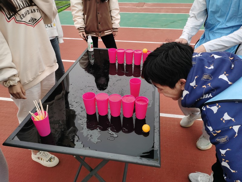 为避免人员聚集,本次运动会采取四人一组制,可男女混合参赛。运动会共设计了四人五足、一穿到底、背靠背夹球等六个趣味项目。每一个比赛项目不仅考验着同学们的动手动脑能力,更是培养了同学们的团结协作,共克时艰的意识。比赛进程中,团队里的每一位参赛运动员的一举一动都牵动着大家的心弦,但欣慰的是同学们不论遇到什么困难都选择共同去克服,他们表现出的同呼吸、共命运,为彼此加油助威的状态,赢得了在场观众不断的欢呼喝彩。