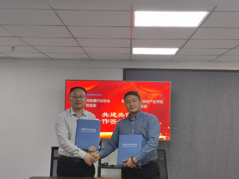 近日,我校体育学院体验产业学院教师党支部与浙江省休闲拓展行业协会党支部举办了共建共促、引领团建行业高质量发展研讨会,并签署了战略合作协议。体验产业学院教师党支部书记薛保红、宣传委员赵德勋、浙江省休闲拓展行业协会党支部书记胡强军、协会秘书长李遥其出席研讨会,万步行体育、大玩咖文旅、巅峰策划、浙景文旅等浙江省休闲团建行业企业代表也参加了研讨会。