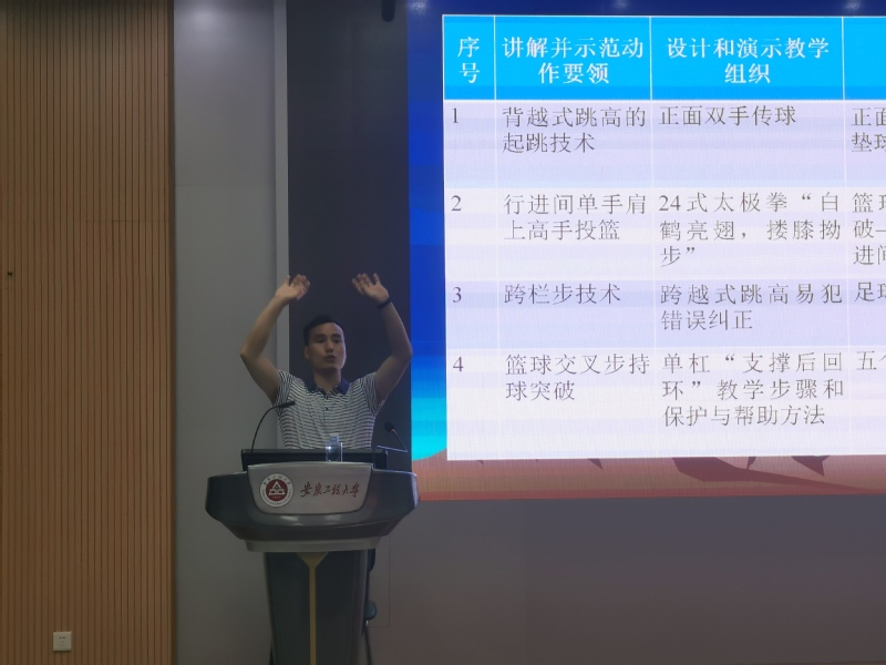 方以龙老师长年耕耘于体育教学领域,现任芜湖市中学体育大组副组长,是体育教师资格考试资深专家。他就近年来体育教师资格考试动态变化情况,结合自己多年从教经验,从教师职业操守、基本能力和应试准备等方面着手,主要围绕教师资格证考试面试的4个主要环节、12个关键点为主要内容进行了详细的讲解和分析,并不时进行示范演示。讲座现场气氛热烈,互动频繁,同学们随着方老师的示范不时进行各种动作模仿,踊跃参与模拟答题。最后提问环节,方老师还对同学们关心的问题逐一进行了悉心解答。