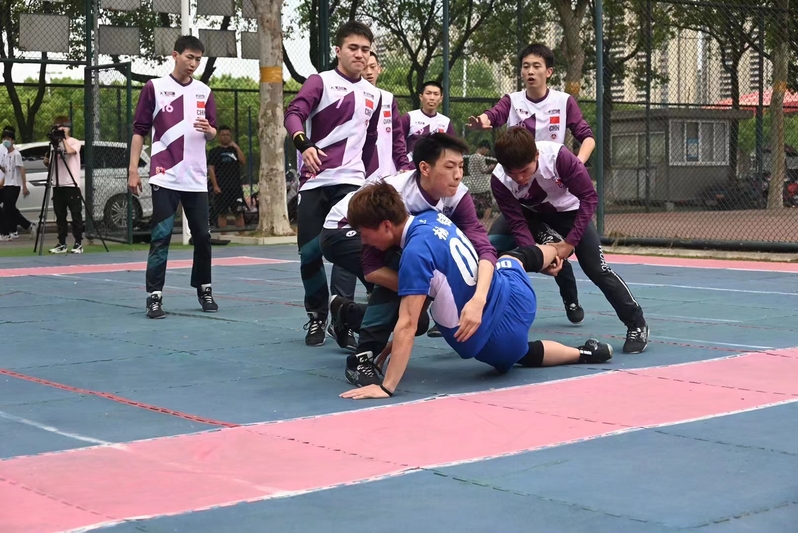 比赛开始后,双方运动员或手触、脚触,或抱膝、抱踝、抱腿控制,或区域联防,或追击,双方都竭尽所能,各展英姿。比赛精彩纷呈,场下的“粉丝”们热情地为场上竞技的同学加油助威。