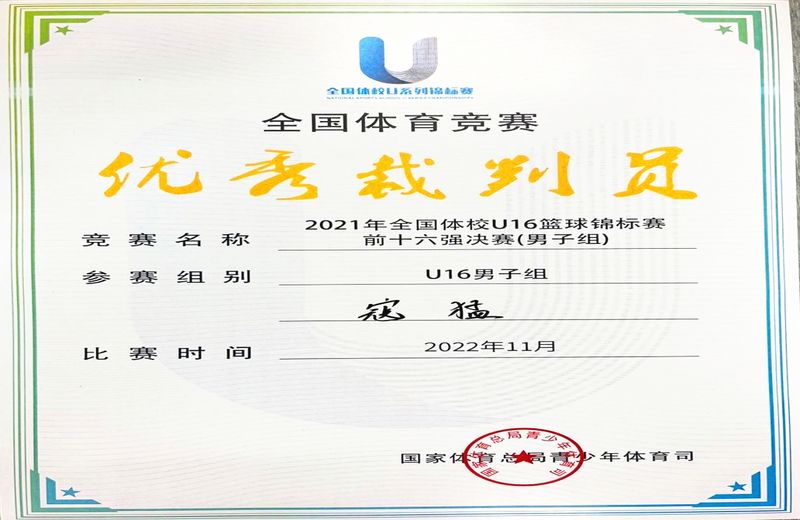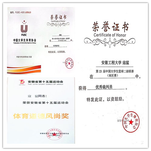 在11月初刚刚结束的全国U系列篮球比赛中,寇猛老师因在多次执裁全国性篮球比赛的出色表现,再次被抽选并担任男子组前十六强决赛裁判一职,成为近年来唯一代表安徽省执裁全国性篮球比赛决赛的裁判员。比赛中,他精湛的专业和公正的判罚得到参赛队伍和赛事组织单位的高度认可,被国家体育总局授予“优秀裁判员”称号。这是我校体育教师参与全国性体育比赛执裁工作中获得的最高荣誉。
