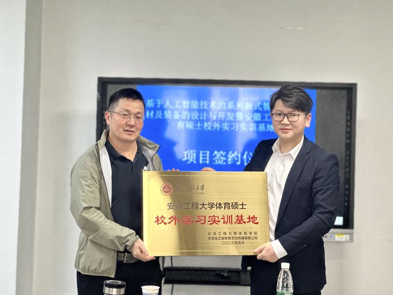 胡好代表体育学院为吴守龙董事长颁发聘书;谢叶寿向芜湖龙之城体育文化传播有限公司颁授“体育硕士实习实训基地”铜牌。