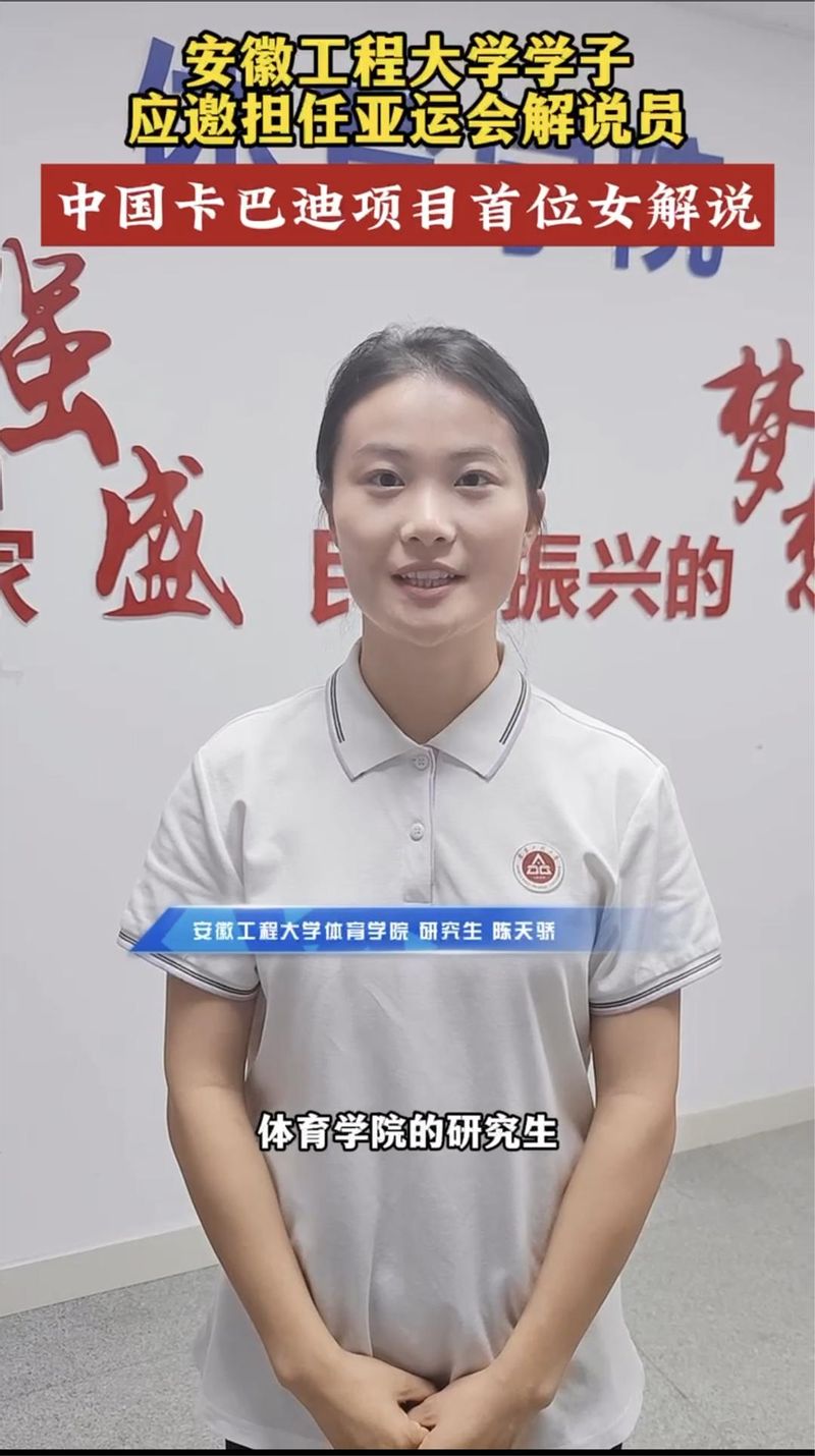 杭州第19届亚运会卡巴迪项目比赛10月2日-7日在萧山瓜沥文化体育中心举行。体育学院研究生陈天骄经过选拔成功当选杭州亚运会卡巴迪项目解说员兼解说顾问。