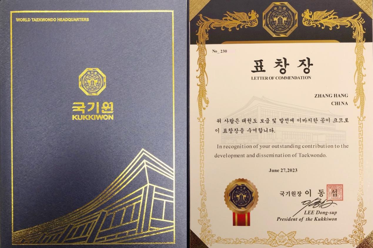 我院青年教师张航被世界跆拳道总部国技院授予表彰状