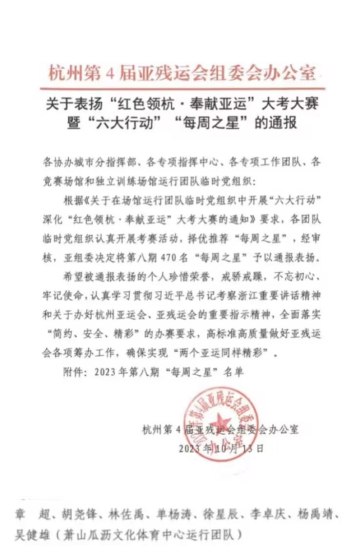 杨禹靖同学积极认真出色的完成亚(残)组委和场馆交办的各项筹备工作,确保各项目赛事的顺利举办,得到各级领导的一致好评,在亚(残)运会工作中表现突出,从几万人中脱颖而出,被评为2023年第八期“每周之星”,为我校增光了添彩。