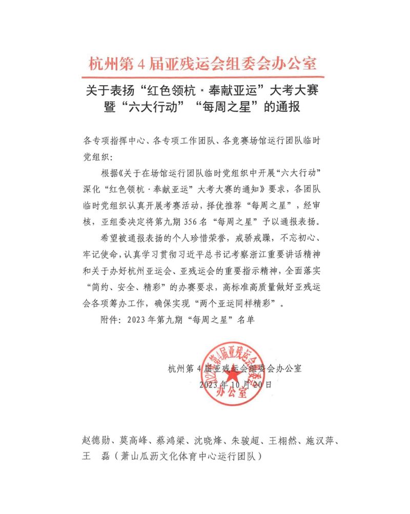 10月24日,杭州亚(残)运会组委会发表《关于表扬“红色领航·奉献亚运”大考大赛暨“六大行动”“每周之星”的通报(第九期)》,我校体育学院赵德勋荣登榜单,荣获“每周之星”荣誉称号。
