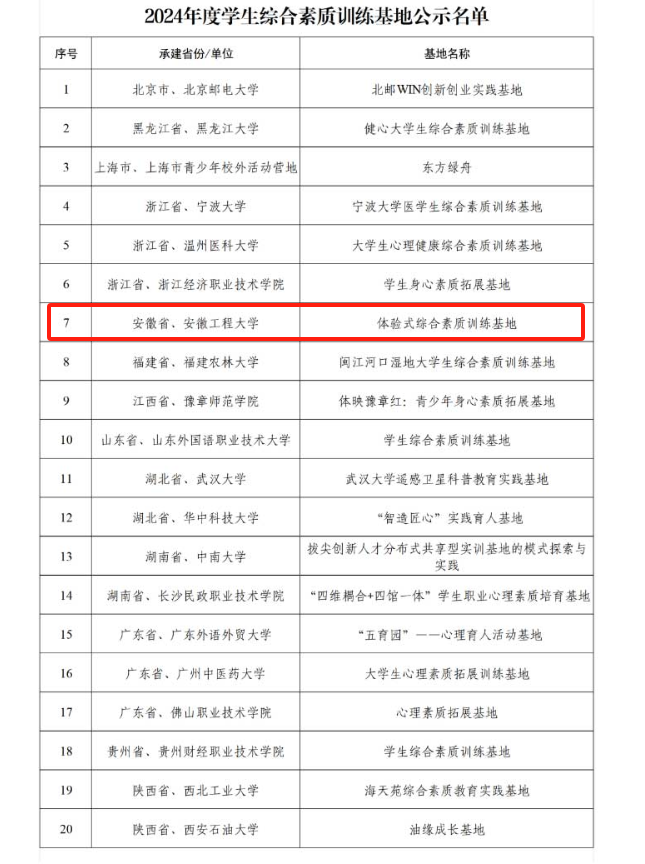 近日,教育部思想政治工作司发布的2024年度高校思想政治工作质量提升综合改革与精品建设项目遴选结果公示结束。体育学院副院长金庆红主持申报的《体验式综合素质训练基地成功入选学生综合素质训练基地项目。此次教育部从全国该类申报项目中共遴选20项立项我校是安徽唯一项目入选高校,这也是我校首次获批教育部高校思想政治工作质量提升综合改革与精品建设项目
