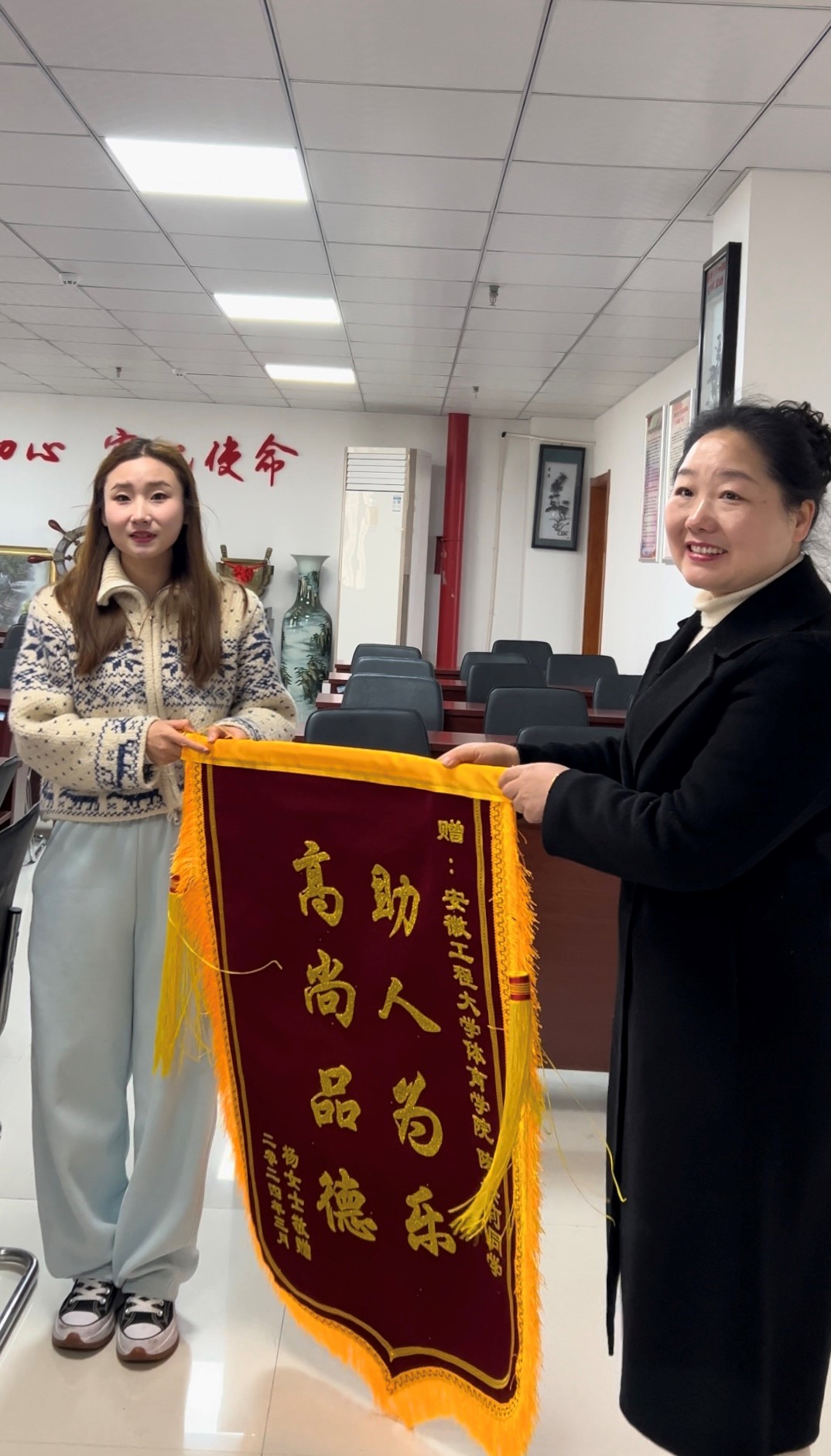 3月12日上午,芜湖市民杨女士专门来到体育学院,特意为体育学院2022级研究生陈杰莉同学送来一面锦旗,感谢学校培养的优秀学生,感谢她助人为乐的精神。