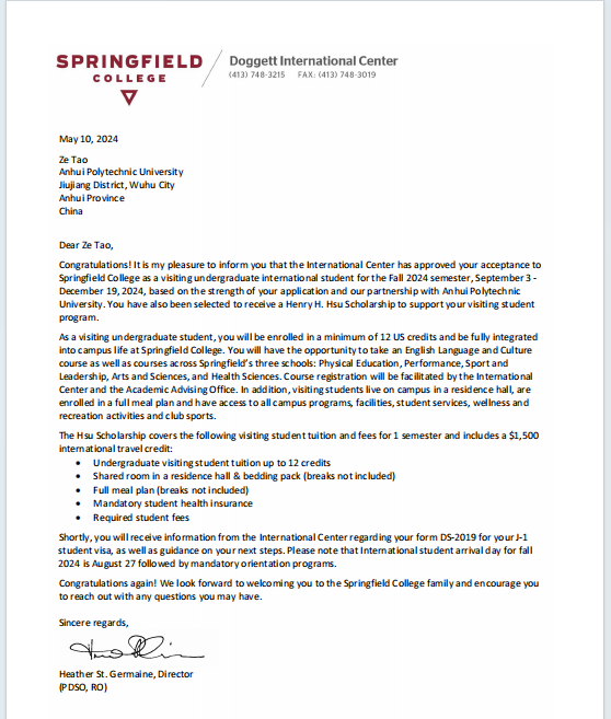 近日,我院体育表演23级本科生陶泽在美国春田学院国际交换生计划申报竞争中脱颖而出,凭借出色的表现,成功获得前往美国春田学院访学的机会,并荣获了Henry H. Hsu国际全额奖学金,即将于2024年第二学期开启一学期的赴美访学。