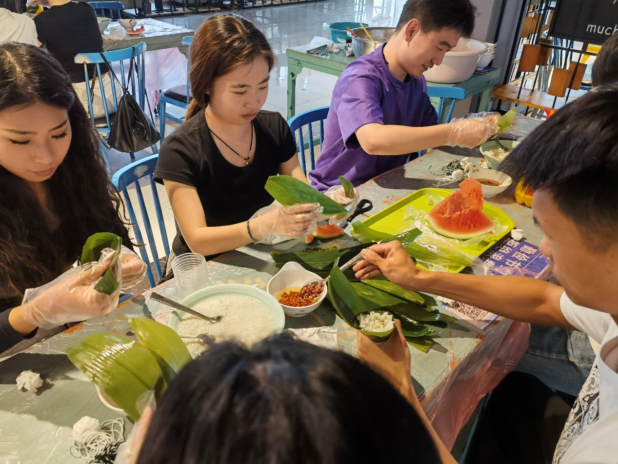 此次活动特别邀请了部分国际留学生一起参与,让他们感受中华优秀传统文化的魅力。大家围坐在一起,折粽叶、填糯米、裹叶子、扎线……一道道工序有条不紊,大家忙的不亦乐乎,互帮互助、欢声笑语,充满了节日的氛围。