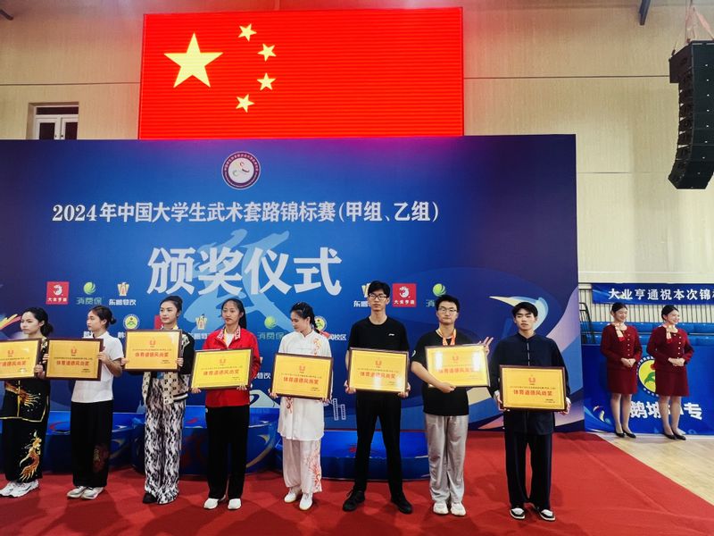 中国大学生武术套路锦标赛是每年大学生参与的最高级别的武术赛事。本次比赛共吸引了来自全国275支高校代表队共2048人参加,其中参赛运动员达近1700名。据悉本次比赛较往年相比项目减少,但参赛人员创历史新高。我校武术队在汪韧老师带领下不畏强敌、顽强拼搏,在高手云集的全国顶尖赛场上脱颖而出,连续三年在全国大学生武术锦标赛中斩获冠军,此次比赛更是创历史最好成绩,斩获三枚金牌。其中计算机与信息学院张伟豪同学斩获普通生组男子象形拳冠军、棍术亚军,经济与管理学院袁福全同学斩获男子普通生组吴式太极拳冠军,体育学院卢子彤同学斩获体院组女子太极拳冠军,体育学院靳培语同学斩获体院组女子拂尘亚军。