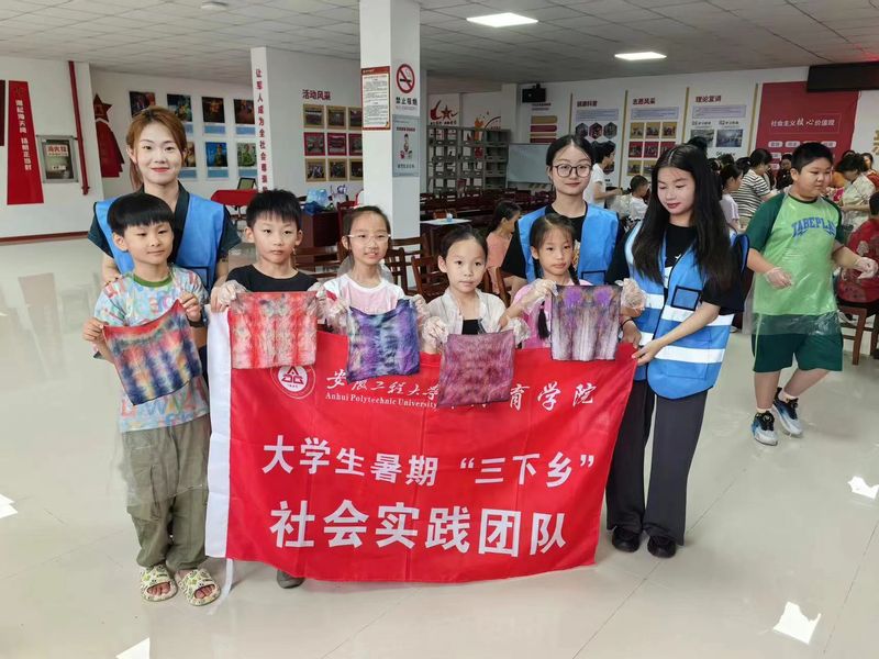 7月12日上午,队员们来到鸠江区官陡街道神东社区,参与了面向社区居民开展社区扎染服务活动。同学们分发提前浸湿的方巾,配备好工具,逐步讲解扎染步骤。活动过程中,团队成员帮助孩子们绑皮筋、拧瓶盖、吸染料,协助孩子们完成许多有创意的扎染小作品。社区志愿服务中,同学们承担起了一份社会责任,学会了关心他人,提高了沟通能力,为丰富社区生活贡献了自己的力量。