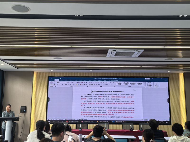 校督导王永忠为老师们做了教学资料规范化的培训,结合第一轮教学资料专项检查情况,强调了审核评估教学资料检查的重点,根据典型案例分析常见问题,与全体教师分享了试卷分析、课程小结等环节撰写的经验。