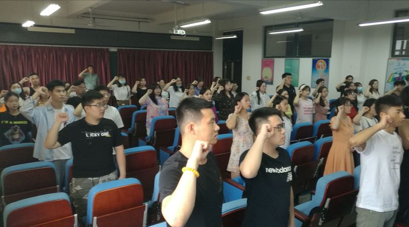 最后,全体起立,高举右拳,注目党旗。由张焱老师领誓,全体毕业班党员庄严宣誓,重温入党时的决心和理想,让党徽在今后的人生征程中闪光。
