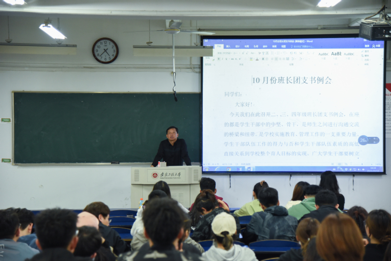 任家钱指出班长和团支书是学生干部中的中坚力量,在班级管理中发挥着至关重要的作用,希望大家积极主动、敢于管理,履职尽责,不断提高自我服务、自我管理、自我监督的能力,营造良好的班级氛围。要求全体班长、团支书要增强政治意识、集体意识、服务意识。要培养无私奉献、埋头苦干以及开拓创新精神,采用劳逸结合的方式,培养同学们的学习兴趣以及工作热情。要处理好同学之间的关系、干部之间的关系、干部与老师的关系以及学习、工作、休息的关系,要本着为同学服务为学校服务的理念,踏实的做好本职工作,不断提高自身的综合素质,加强自身修养。最后,对班级管理、学风建设、困难认定及奖助学金评选、寝室管理、班级日志记录等工作作了布置。