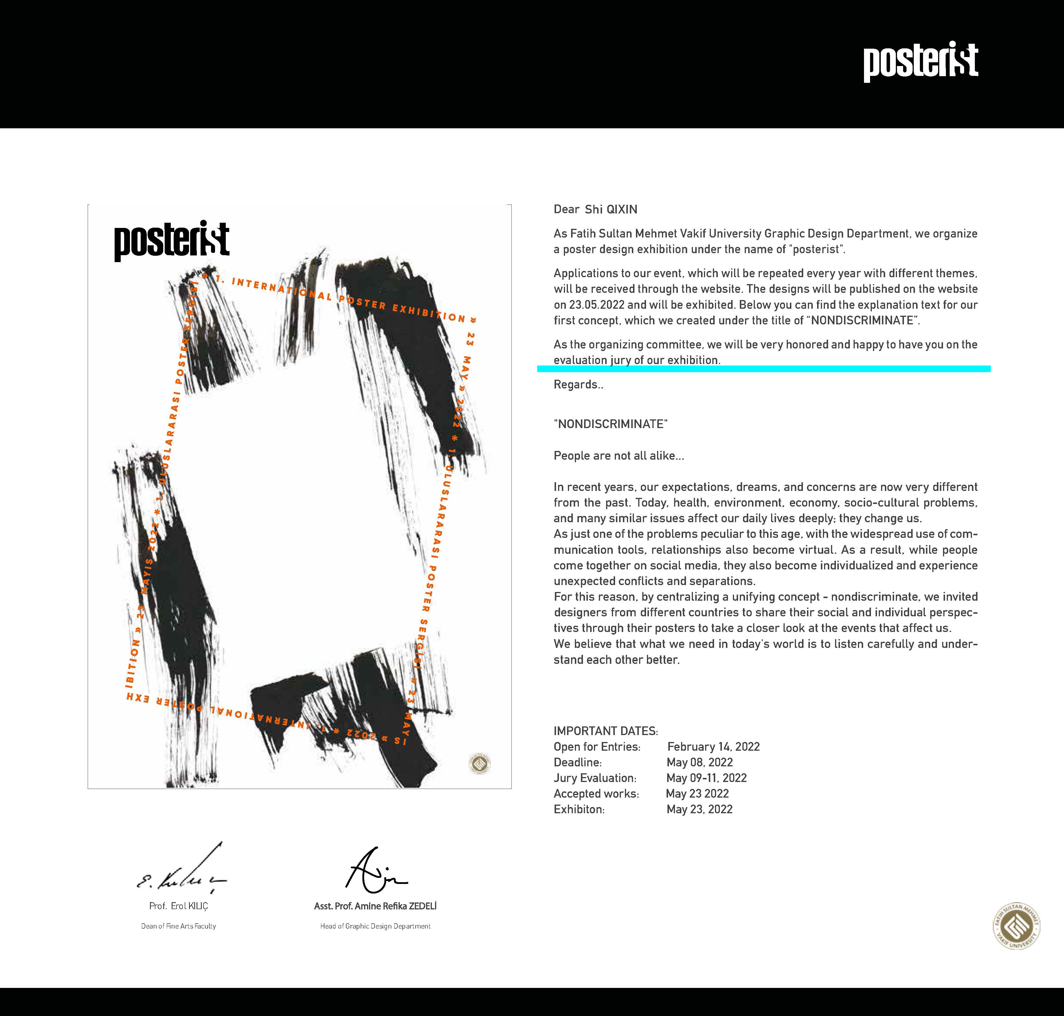 新年伊始,艺术学院史启新教授收到来自土耳其Fatih Sultan Mehmet Vakif University(法蒂赫·苏丹·迈赫迈特·瓦基夫大学)美术学院院长埃罗尔教授的邀请,担任土耳其posterist国际海报展(posteristInternational Posterist Exhibition)国际评委。海报评审团19位成员由土耳其以及国际杰出的学者和设计师组成。本项目由土耳其伊斯坦布尔Fatih Sultan Mehmet Vakif University主办。