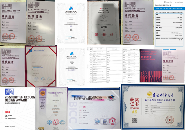近一学年,产品设计二年级和三年级同学在全国工业设计大赛获得二等奖1项、三等奖3项;安徽省第九届全国工业设计大赛赛区获二等奖1项;第二届BICC中英国际创意大赛中获铜奖5项;第四届香港大学生当代设计奖获铜奖5项;在首届中国文化办公用品创意设计、2022SGADC-新加坡金沙艺术设计、“包豪斯奖”国际设计、第六届国际环保公益设计、第四届日本新概念设计赛等赛事中获奖频频。