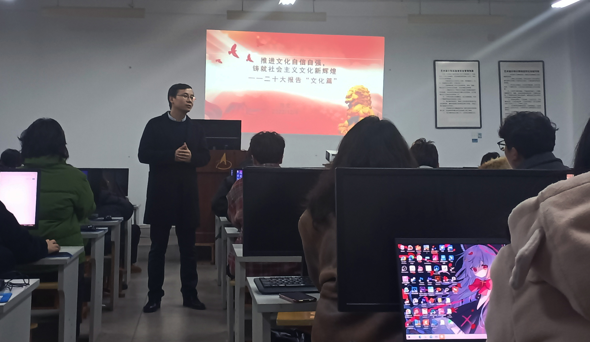 12月5日,陈党以“推进文化自信自强,铸就社会主义文化新辉煌”为题,为动画191班学生宣讲,解读二十大报告中的“文化篇”。他结合自身学习,向同学们讲述了增强文化自信、践行社会主义核心价值观、繁荣发展文化事业和文化产业、增强中华文明传播力影响力。