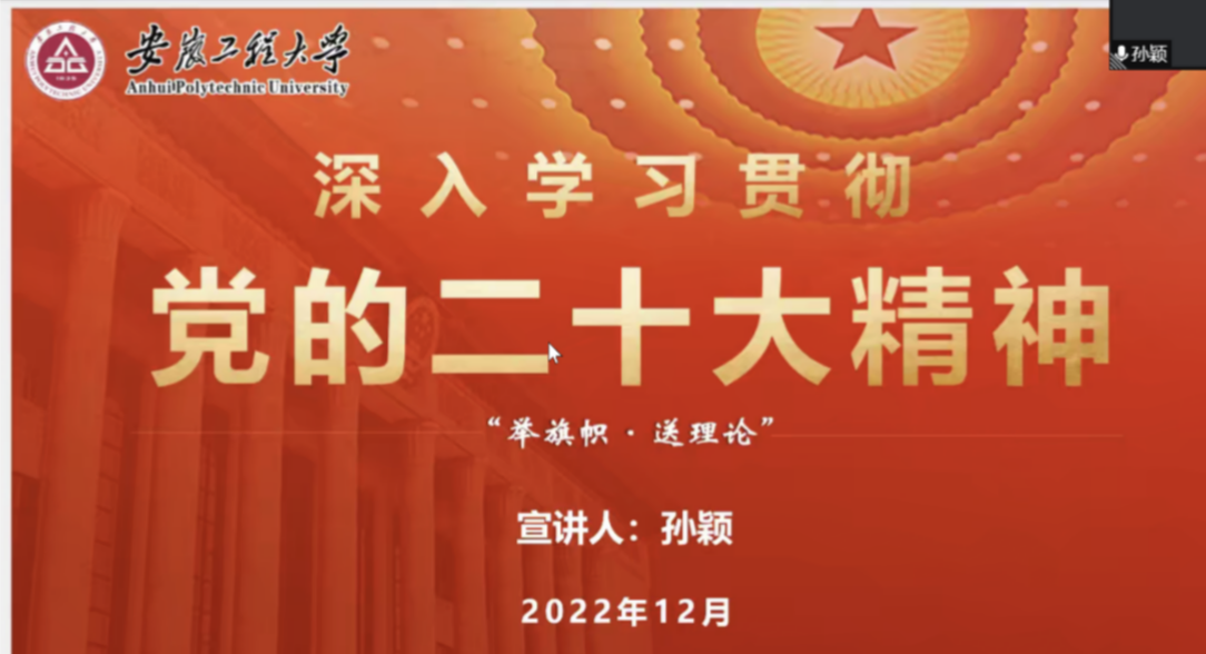 12月23日上午,设计学院通过线上开展了党的二十大精神宣讲。校宣讲团成员、经济与管理学院副教授孙颖主讲。设计学院党委书记胡家增主持,学院党委理论学习中心组成员、学院教职工、部分学生党员参加。