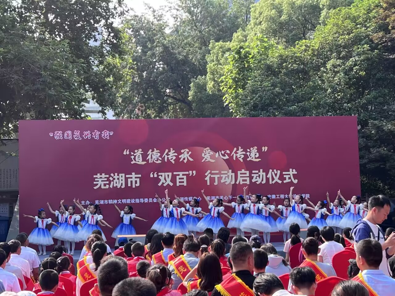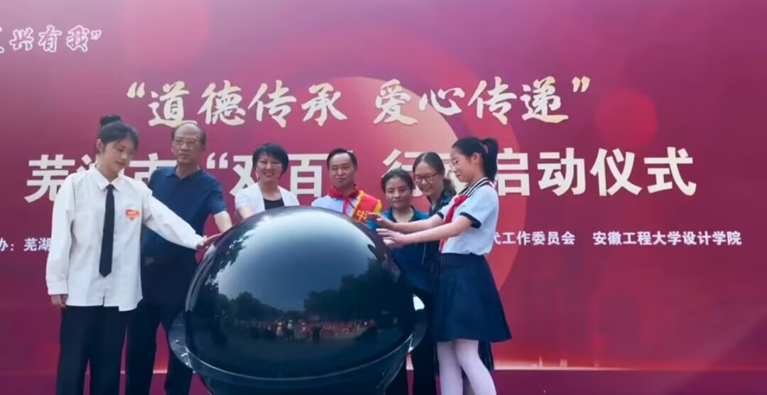 在百名道德模范和身边好人、百名优秀小记者的共同见证下,设计学院党委副书记彭海燕、广告学专业学生代表谭梦婷和市文明办、芜湖传媒中心、市关工委等相关部门代表,好人代表记者代表一起开启仪式球,“双百”活动正式开始。