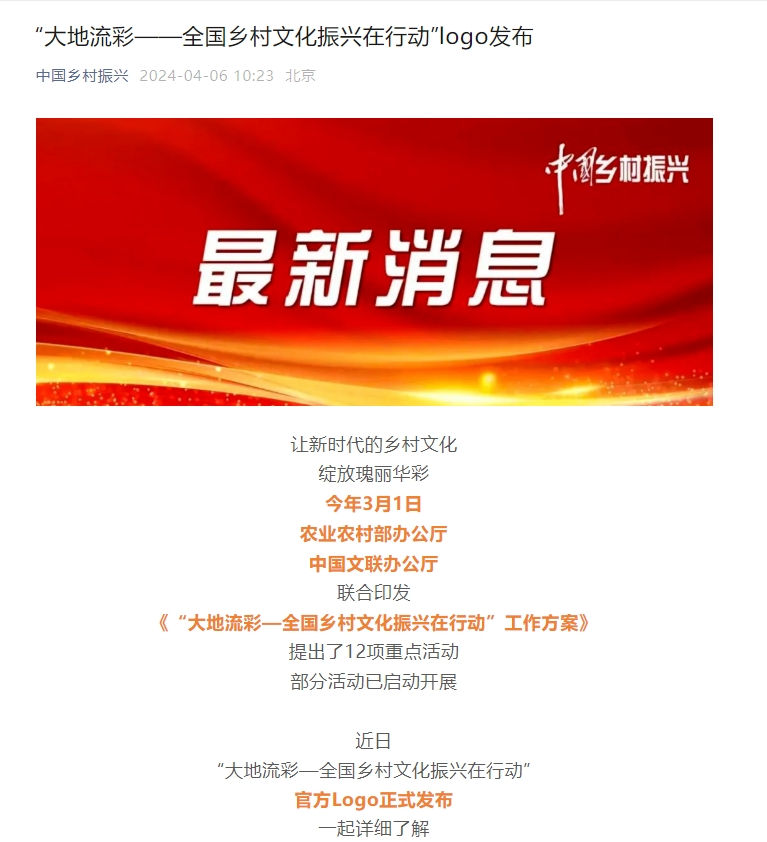 为深入学习贯彻习近平文化思想,贯彻落实习近平总书记关于“三农”工作的重要论述,根据中央农村工作会议、中央一号文件部署要求,农业农村部办公厅、中国文联办公厅联合印发《“大地流彩—全国乡村文化振兴在行动”工作方案》。2024年是新中国成立75周年,是实现“十四五”规划目标任务的关键一年。“大地流彩——全国乡村文化振兴在行动”以打造“有影响力传播力的管用平台”为抓手,坚持发挥农民主体作用,部署了“听党话、感党恩、跟党走”宣讲、“粮安天下”农民公益培训、“爱中华爱家乡”中国农民诗会、“宜居宜业和美乡村”农民文艺作品展、“新国潮”乡村优秀文化艺术展演、乡村记忆工程、乡村文化地图发布、乡村大讲堂、农耕农趣农味文化体育活动、乡村文化产业创意大赛、乡村文化艺术基地培育、全国乡村文化艺术展演季等十二项重点活动,广泛宣传党的创新理论,全面加强乡村文化保护传承,推动农耕文明优秀遗产与现代文明要素有机结合,促进乡村文化资源创造性转化和乡村文化产业创新性发展。