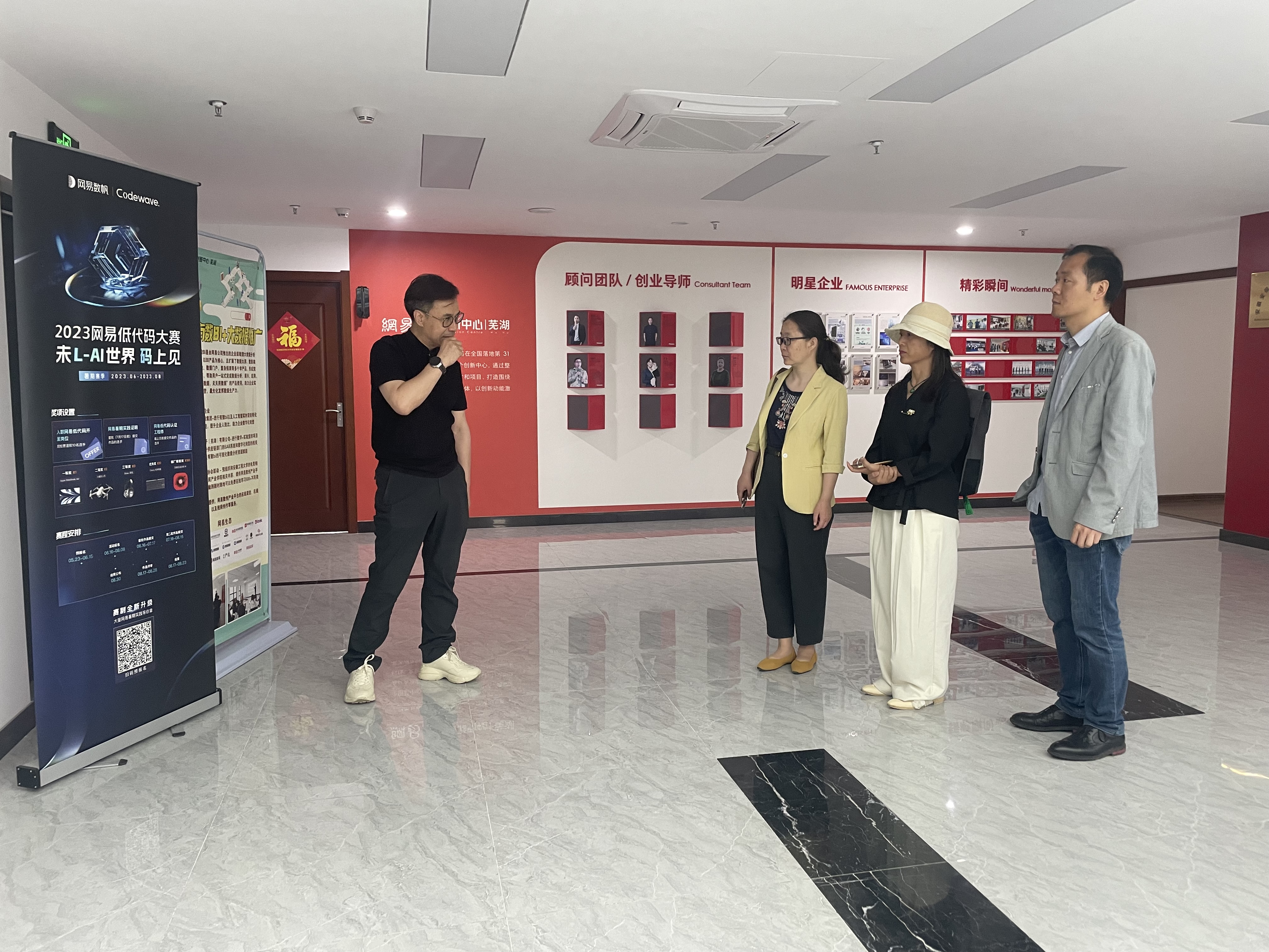 2024年5月9日,设计学院党委副书记彭海燕、副院长王小元、视觉传达设计系主任费利君一行赴芜湖网易联合创新中心,开展校企合作调研活动。此次调研旨在深化校企合作,探索个性化人才培养路径,加强人才供需对接,并为学生挖掘更多实习与就业机会。