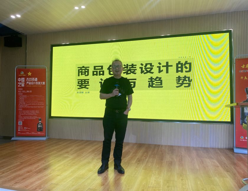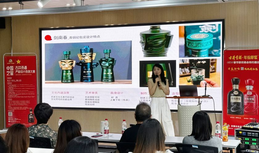 视觉传达设计专业张翠老师从专业视角并结合自己的设计经验,向大家展示了多个白酒包装获奖案例,深入讲解了白酒包装设计的关键要素,展望了白酒包装设计的未来趋势。古井贡酒产品设计部经理吴瑞向大家介绍了公司的企业文化,并对大赛主题和投稿要点进行了详细解析,为同学们参赛提供了明确指导。最后,中国包装联合会设计专业委员会全国常委史启新教授分享了商品包装设计的精髓和潮流方向,强调将人性化与自然环境融入设计之中,鼓励创新思维和运用新材料,展现自己的设计才能。