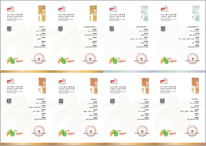 近日,第16届全国大学生广告艺术大赛全国总评审结果公布,我校设计学院学子在国赛获奖22项,其中一等奖2项、二等奖2项、三等奖4项、优秀奖14项。在此前的安徽赛区评审中,设计学院学子共获赛区等级奖96项,其中一等奖20项、二等奖42项、三等奖34项。