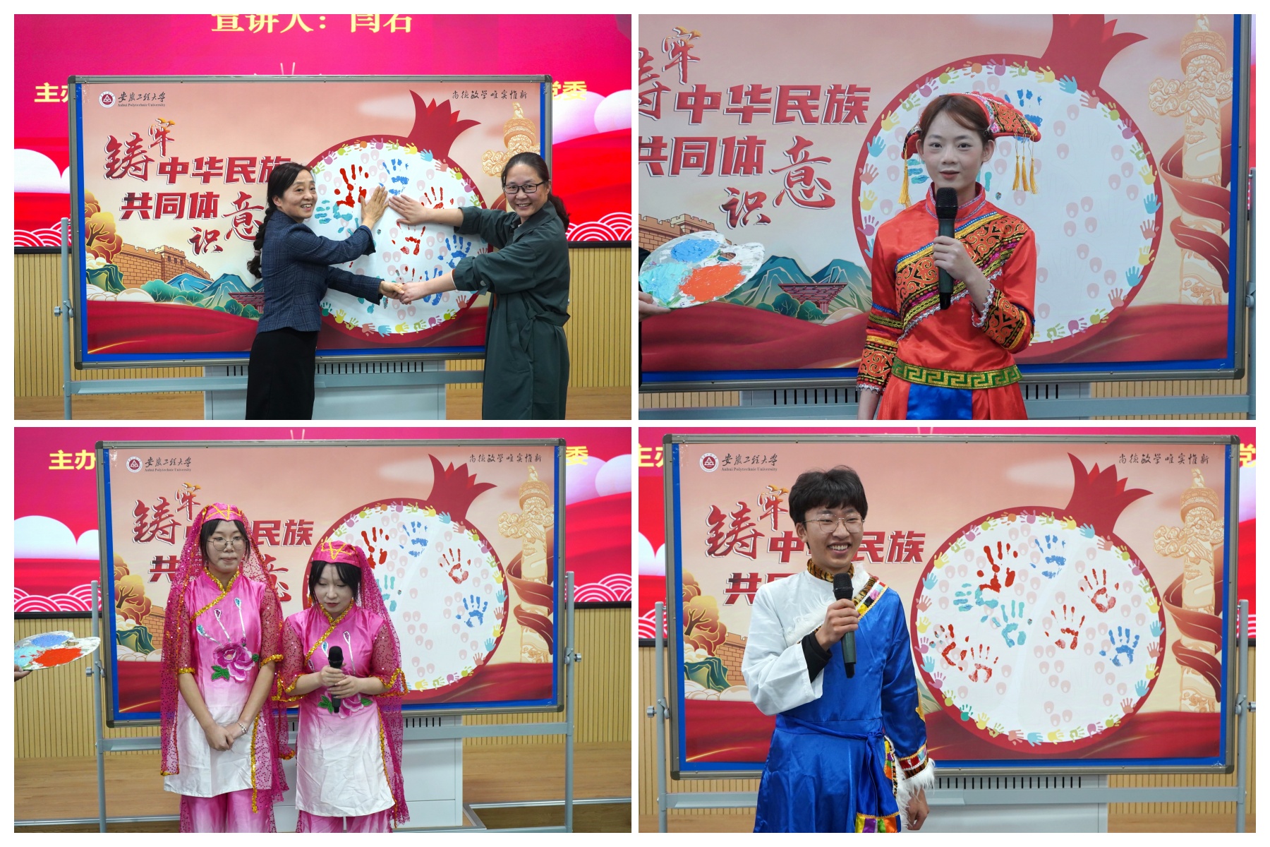 活动期间,各民族师生代表共绘“石榴籽”精神主题掌纹画,在掌纹画上郑重地按下了各自的手印。这一举动不仅生动展现了青年学子丰富多彩的民族文化与个性魅力,更深刻地象征着他们携手并进、共同铸牢中华民族共同体意识的坚定决心与崇高信念,成为民族团结进步道路上一个亮丽而深刻的印记。